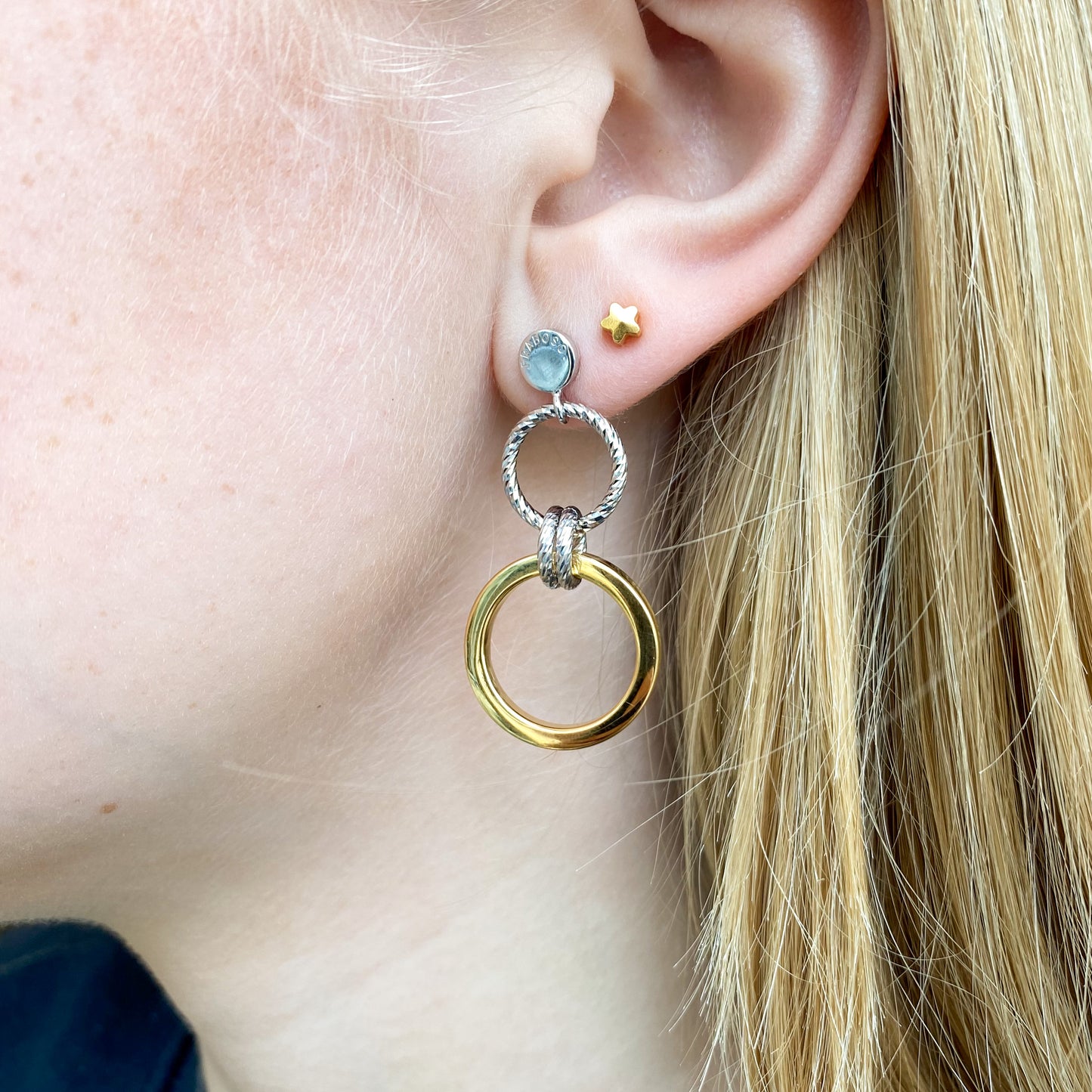 Introducing these two-tone Sunshine Silver Circle Drop Earrings - a stylish way to dazzle with gold and silver! These versatile earrings are perfect for any occasion - from a night out, to a day in. Spread your sunshine wherever you go!